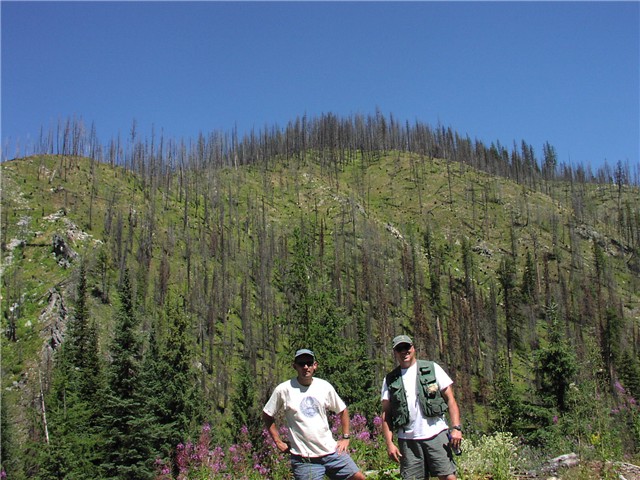 Dennis & I on the hill where the Lochsa fire started two years ago. We saw the blaze start at a logging camp where a log loader was still parked. There was nothing we could do but get out of there. It burned for probably 20 miles. |